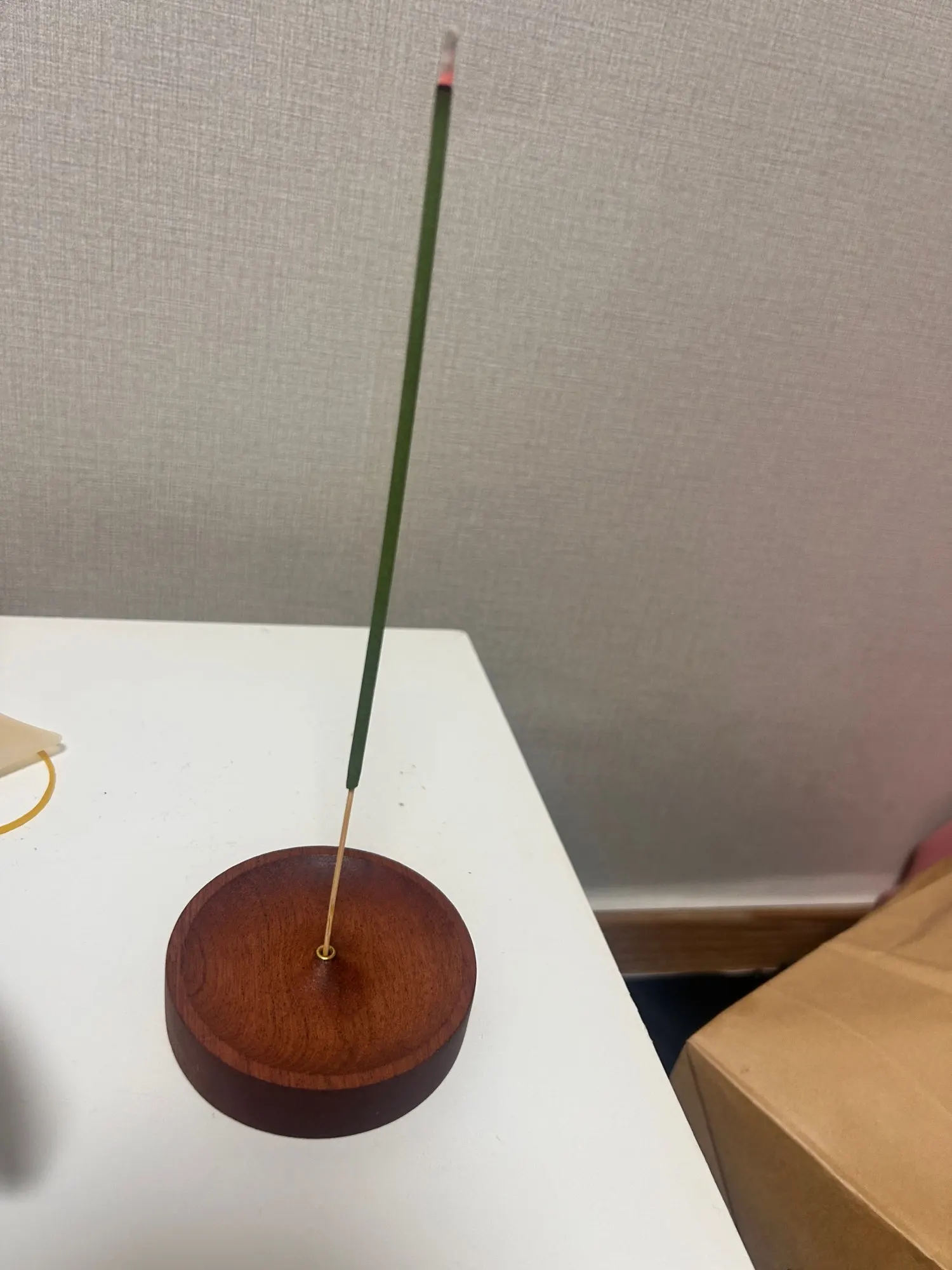 This works really well for a certain kind of small incense stick, the kind that doesn't really have a wooden stick core. The ashes fall within the diameter of the stand here and everything stays pretty neat.